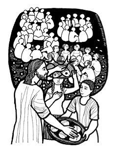 Jesus welcomes all that go to him, speaks his liberating word to them, and gives them food when they are hungry. In the Eucharist Christ gives himself and renews the covenant.